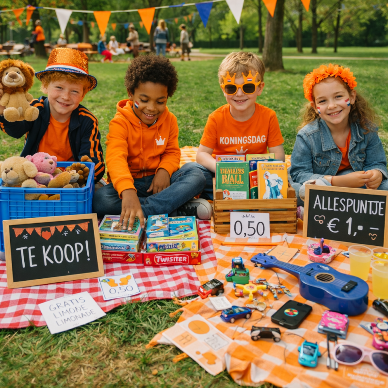 Organiseer een kleedjesmarkt op de BSO! Kinderen verkopen spullen, maken prijskaartjes en oefenen met rekenen in deze leuke Koningsdag activiteit (4–12 jaar).